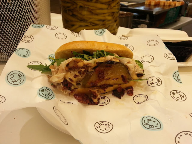 El bocadillo de cerdo asado con encurtidos del Bicnic (c. Girona, 68) era muy sabroso.